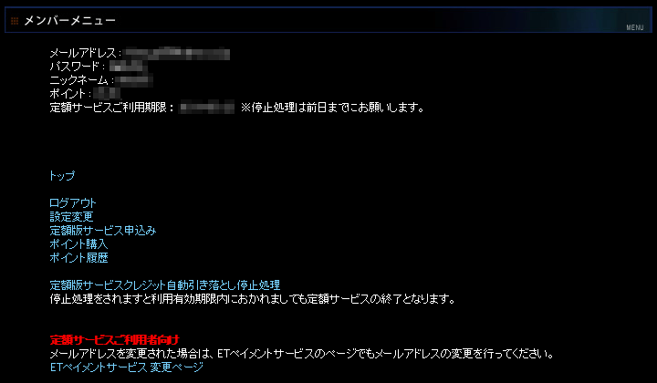 【定額サービス・クレジット決済の場合】自動的に延長・継続されますので、解約する場合は期限日の前日までに『メンバーメニュー』から『定額版サービスクレジット自動引き落とし停止処理』をしてください。